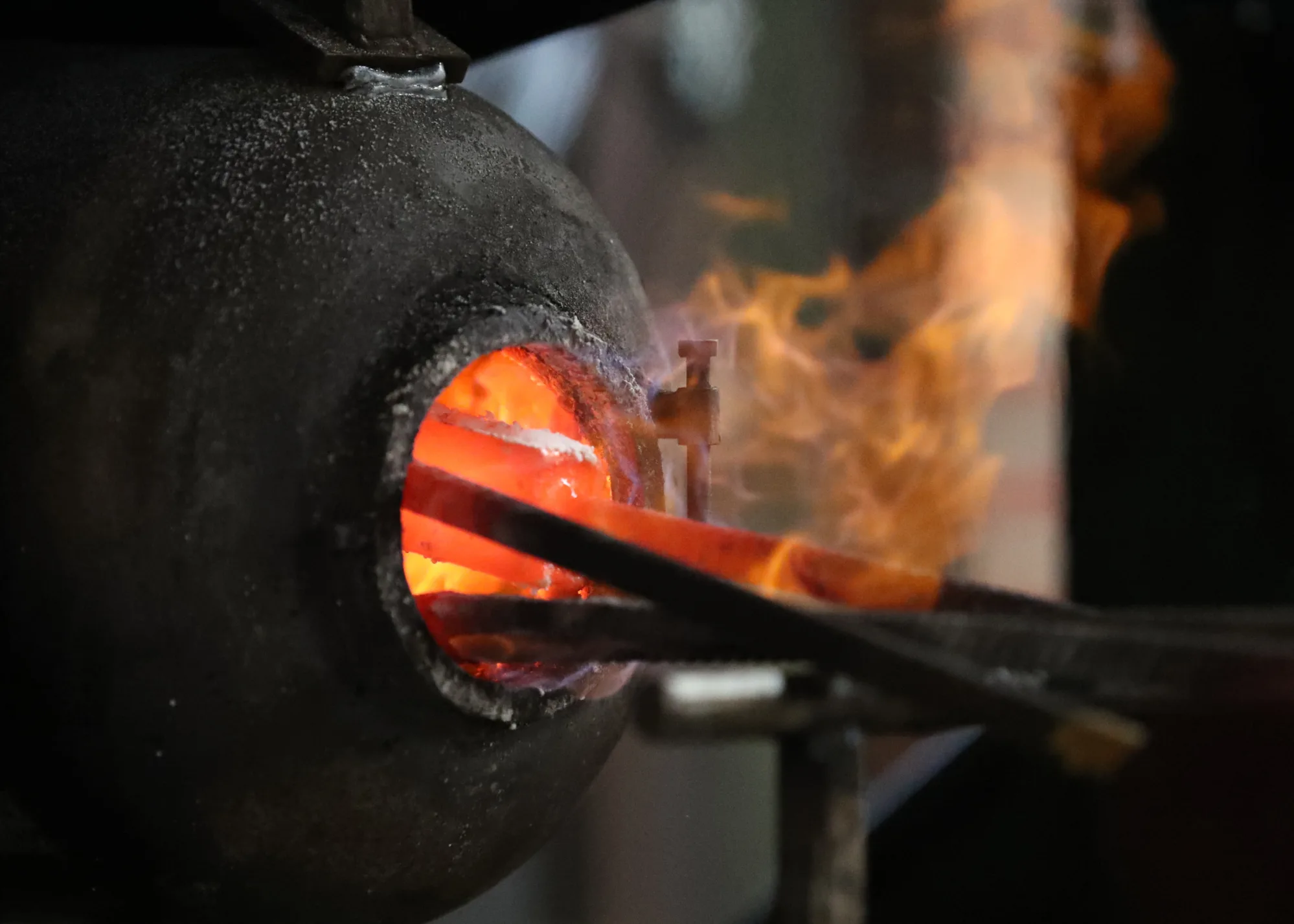 Dann beginnt die eigentliche Arbeit und Du stellst Dein eigenes Damastpaket zusammen und verschweißt es anschließend mit Hammer, Amboss und Lufthammer. Wir falten dieses Paket mehrmals, um die gewünschte Anzahl an Lagen zu erhalten. An diesem Tag wirst Du das alte Handwerk und die Hitze, die zum Schmieden des Stahls benötigt wird, wirklich erleben. Das Endergebnis wird erneut in einem Ofen auf 730°C erhitzt, danach wird es während der Nacht langsam wieder abgekühlt und wir können es am nächsten Tag weiter bearbeiten.