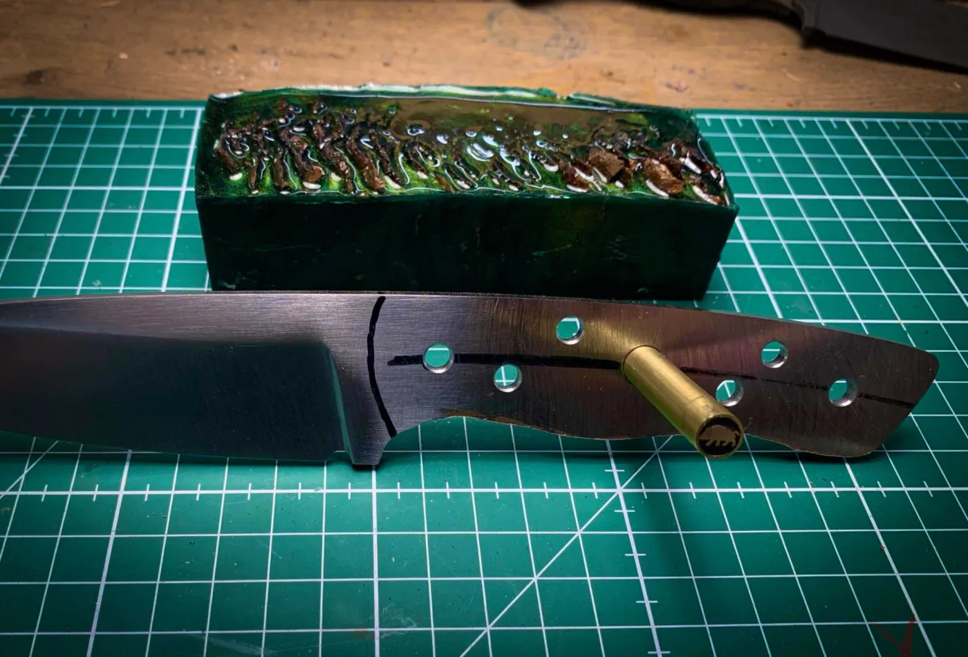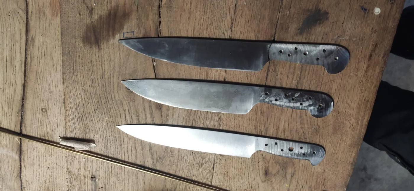 In de GRUNDKURS schmieden wir Küchenmesser mit eine Klingenlänge von 17 cm lang oder Jagd- / outdoormesser mit eine Klingenlänge von 13 cm. Wir schmieden wilder Damast bis zu 160 Lagen. Als Griffmaterial stehen eine vielfalt von edele Hölzer zur Verfügung sowie Kohlenfaser-, Messing- und VA-Stifte.