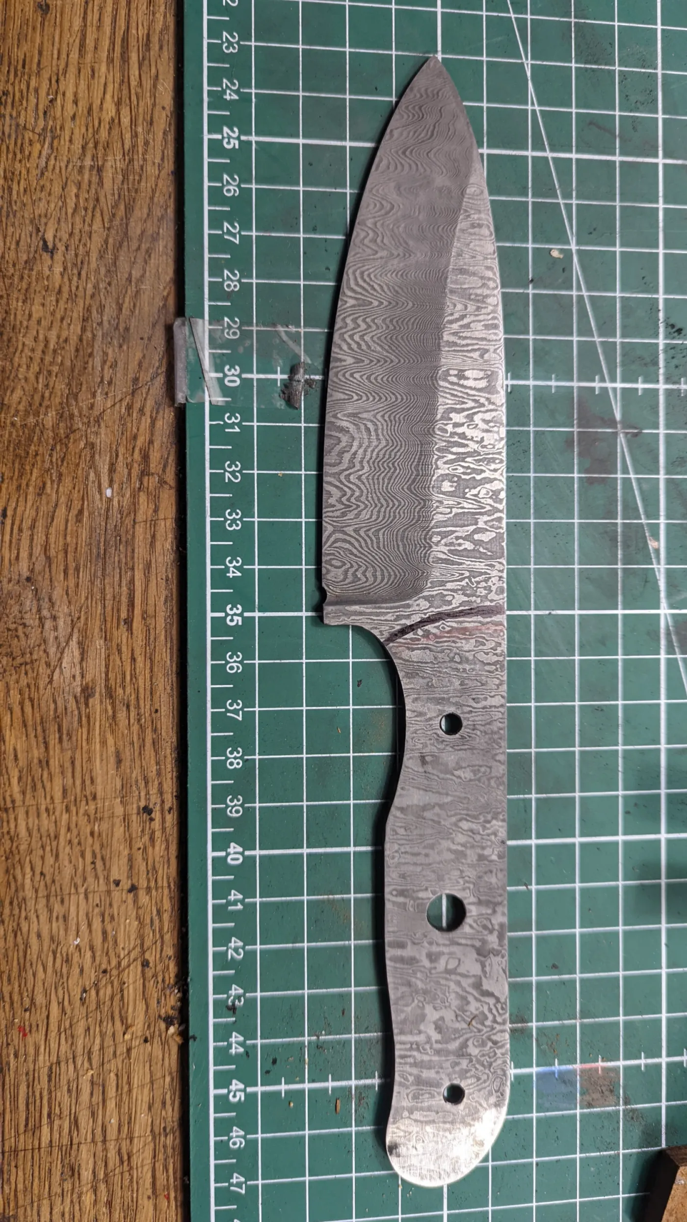 Während dieser recht intensieve Tag verwandeln wir die geschmiedete Damast-Platine in ein Messer. Zuerst übertragen wir die Form der Klinge auf die Platine und sägen und schleifen die Klingengeometrie grob vor. Dann wird der Klingenrohling mittels Topfschleifmaschine perfekt flach geschliffen. und auf die exakt gewünschte Dicke gebracht. Wir verwenden moderne Messerschleifmaschinen, um das Messer zu formen und die Klinge zu schärfen. Das richtige Finish erhält das Messer von Hand durch Feilen und Schleifen. Nachdem die Löcher für die Griffbefestigung gebohrt wurden, führen wir eine optimale Wärmebehandlung des Stahls durch. Nach dem Härten und Abschrecken in speziellem Härteöl lassen wir den Stahl an, um neben einer hohen Härte auch eine ausreichende Zähigkeit der Klinge zu erreichen. Die Klinge wird dann geätzt, wodurch das einzigartige Damastmuster sichtbar wird.