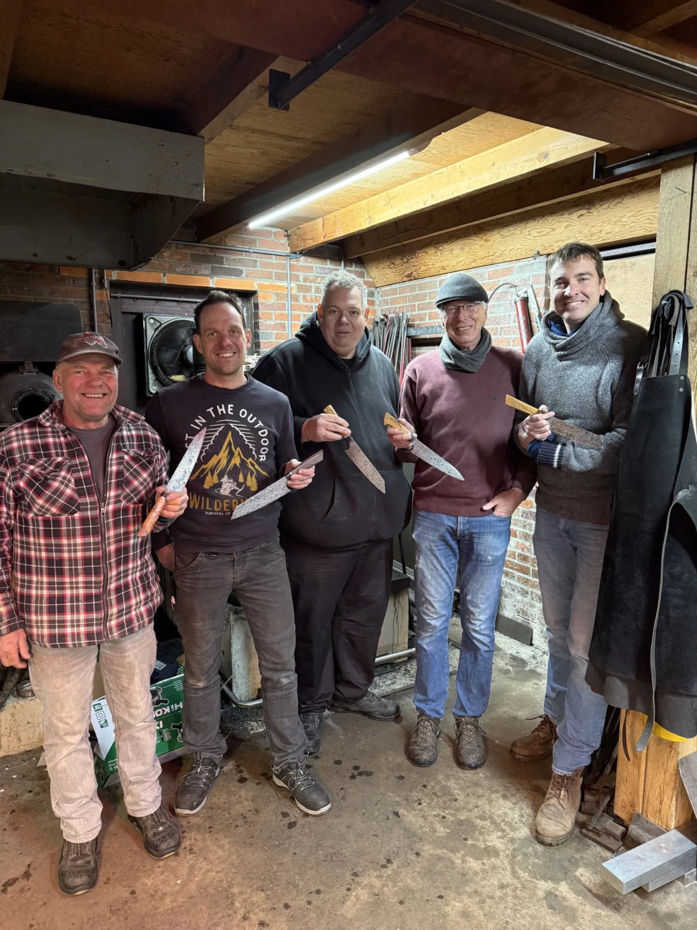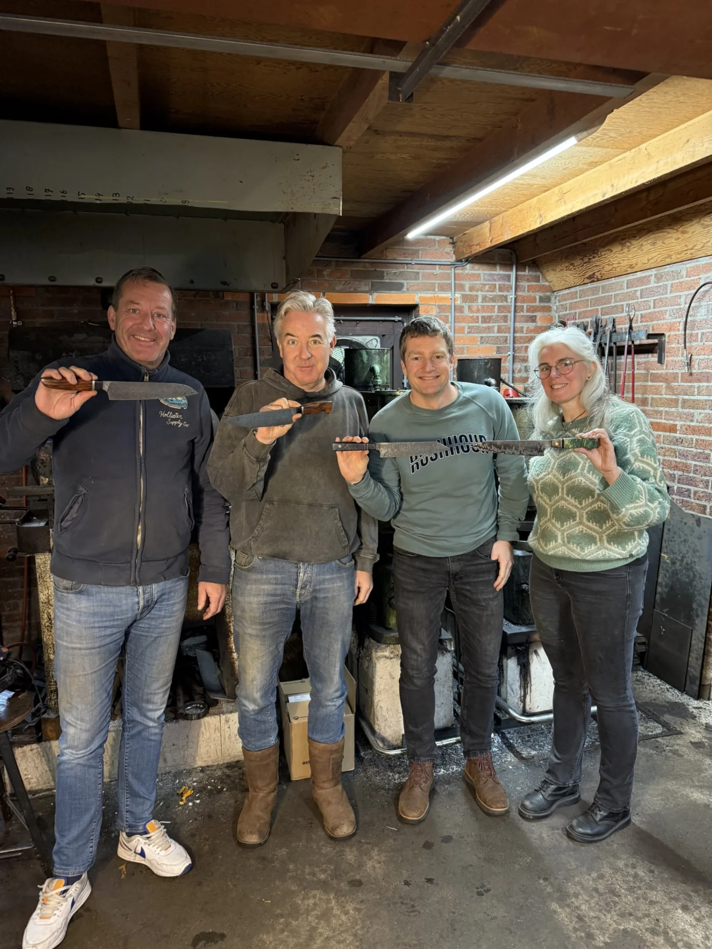 "Ralf, Jan, Martien und ich haben erfolgreich unser erstes Messer bei Ruig in Holland geschmiedet. Unser Ergebniss kann kann sich mehr als sehen lassen. Danke an Gerwin. LG Horst"